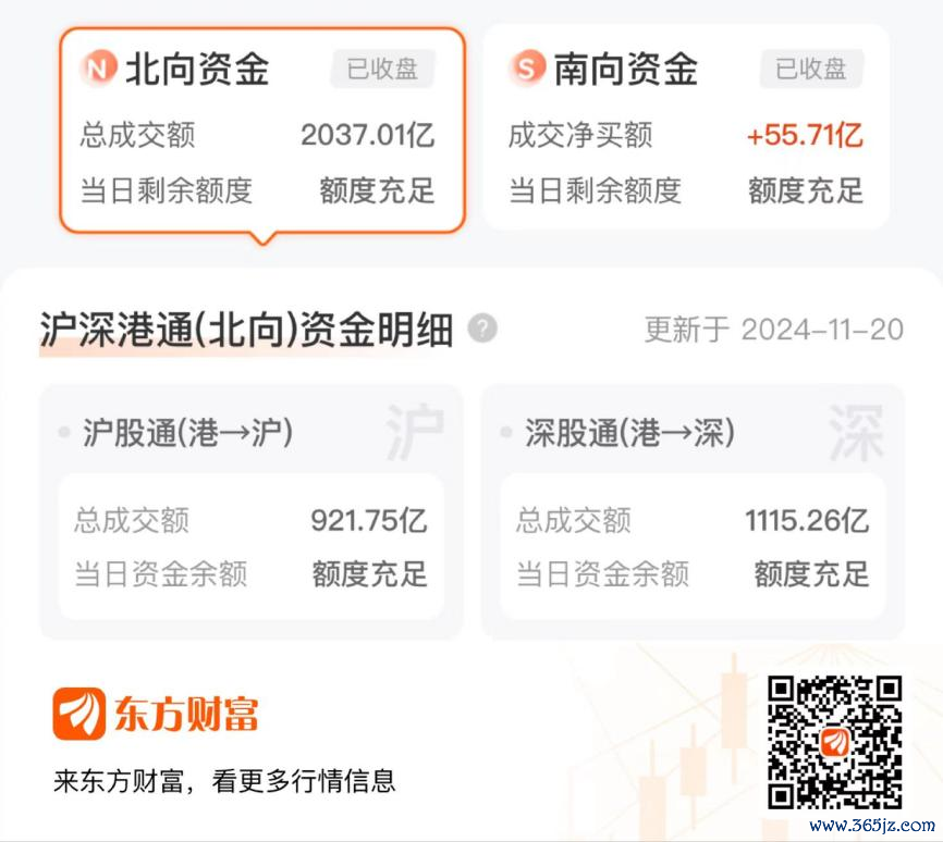 11月20日,两市延续反弹,三大指数均小幅收涨。北向资金当日成交2037.01亿元,占沪深两市总成交额的12.62%。