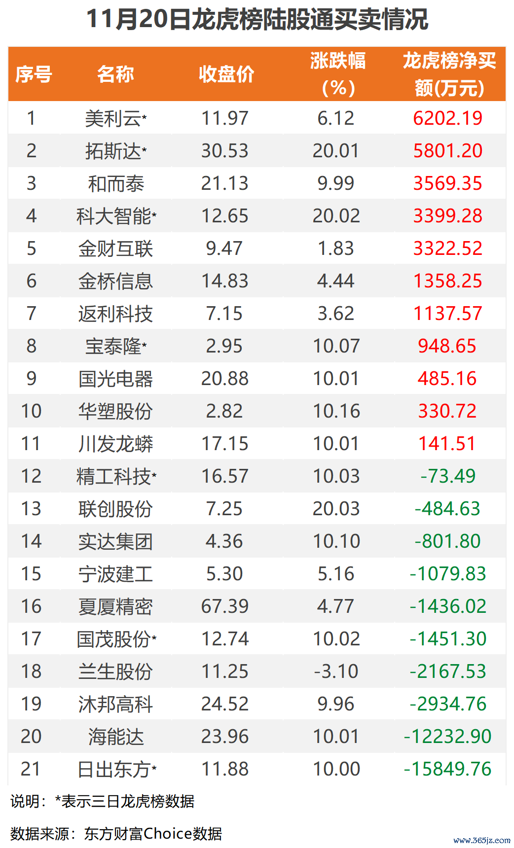 今日陆股通参与龙虎榜中个股共涉及21股,其中11股被陆股通净买入,美利云被买入最多,三日净买入6202.19万元;另外10股被陆股通净卖出,日出东方被卖出最多,三日净卖出约1.58亿元。